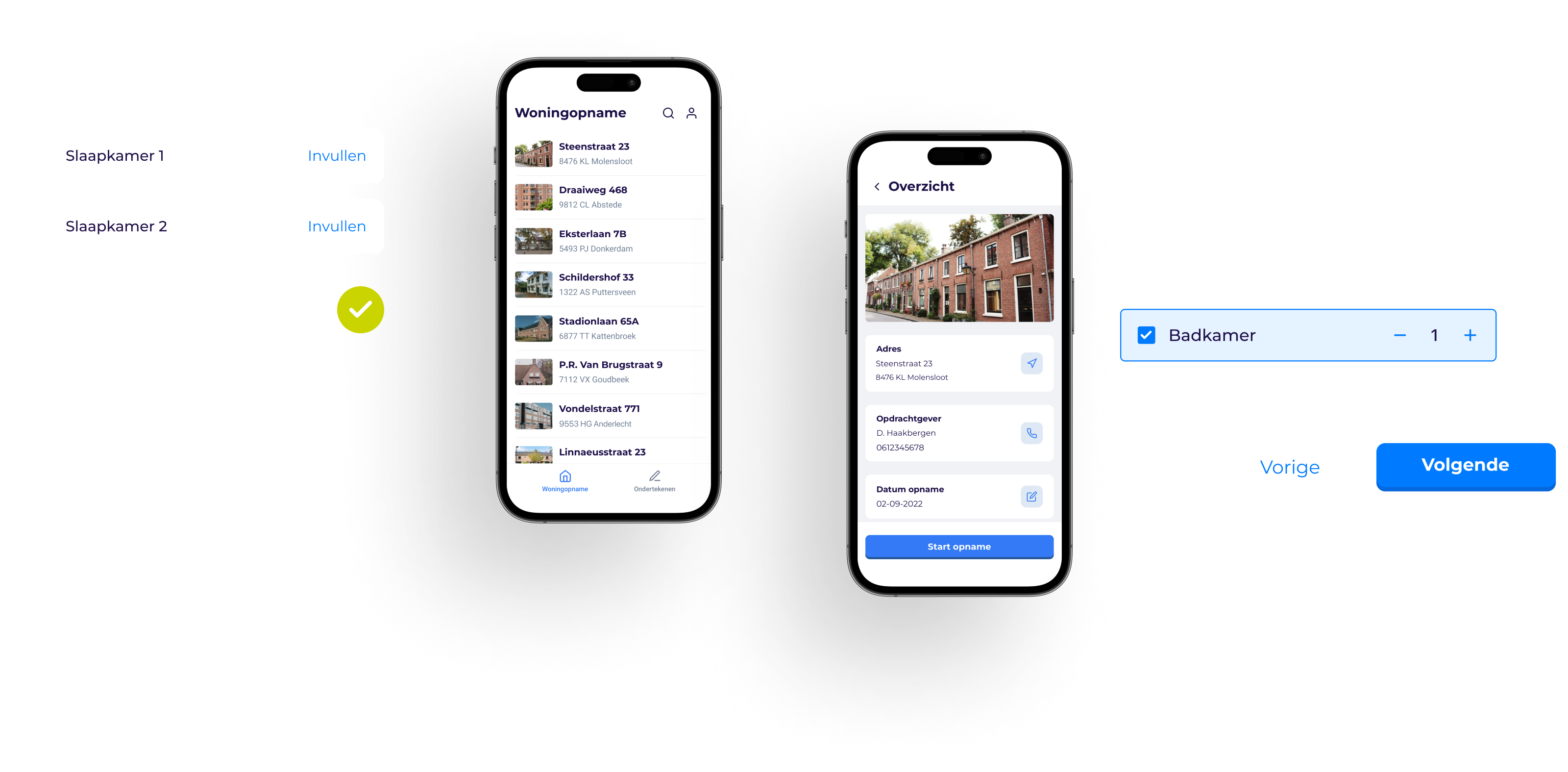 Foto's kunnen per ruimte of opnameonderdeel worden toegevoegd aan het rapport. Ook de bouwkundige opnamestaat via app worden ingevoerd.